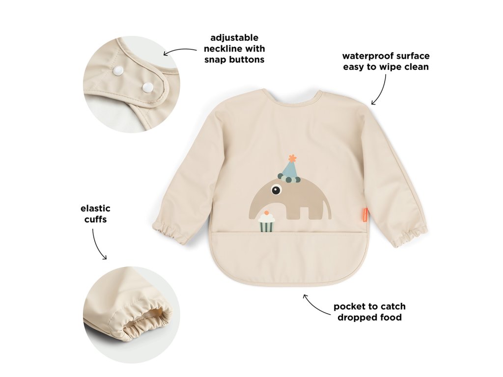 Tento roztomilý bryndáček v hezké barvě. Bryndáček zajišťuje čistotu svým voděodolným povrchem a chrání oblečení před politím a nepořádkem. Rukávy udržují oblečení vašeho dítěte v bezpečí.