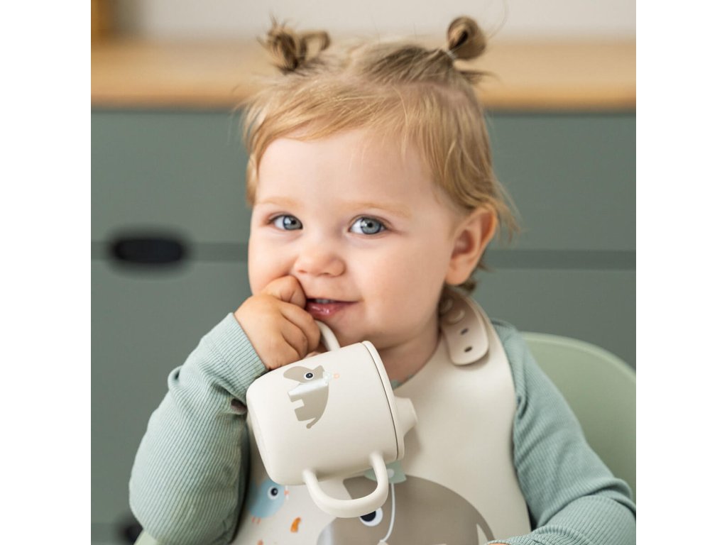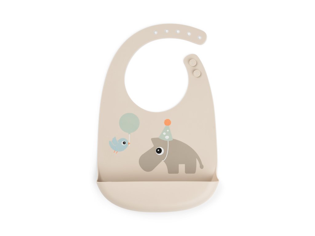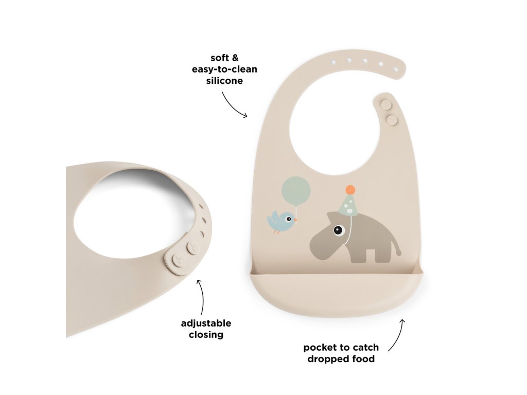 Zebra Zebee vykukuje z praktického silikonového bryndáčku - připravený zachytit každý drobeček. Bryndáček je voděodolný, snadno se otírá. Kapsa zachytí padající jídlo a ušetří vám spoustu času při úklidu.