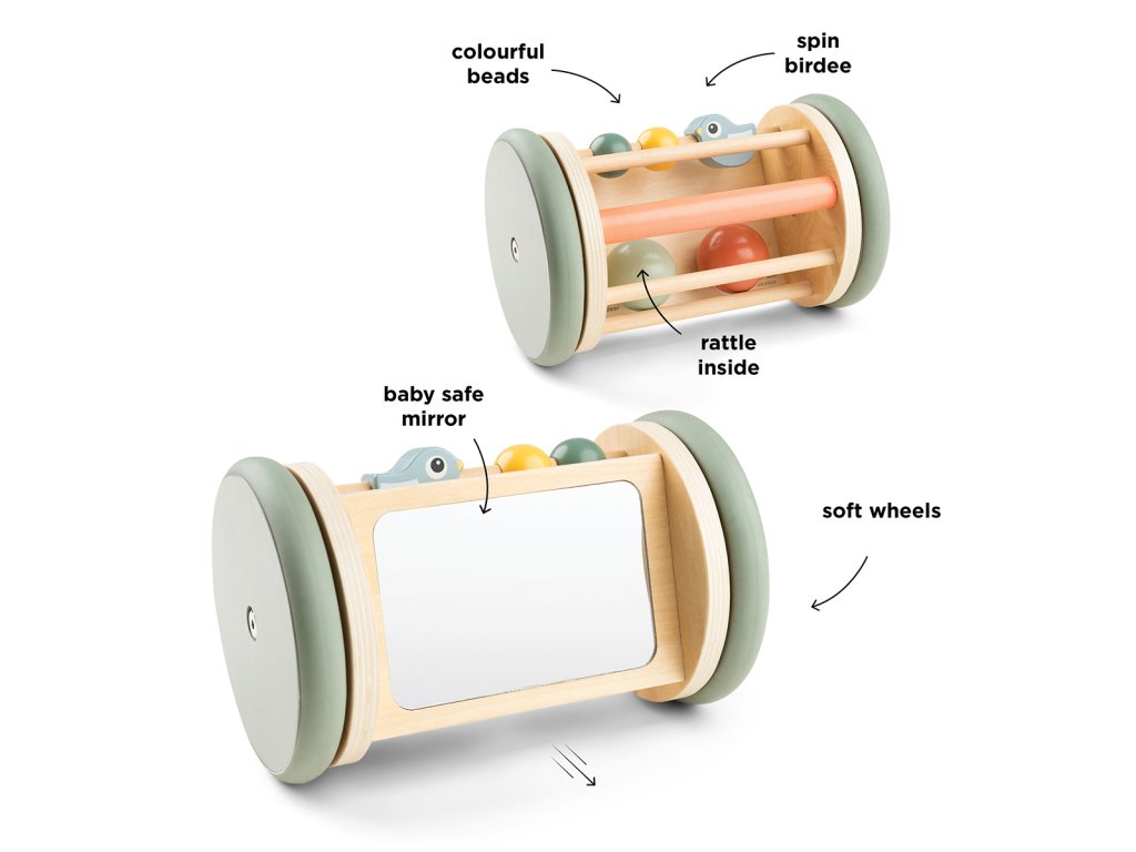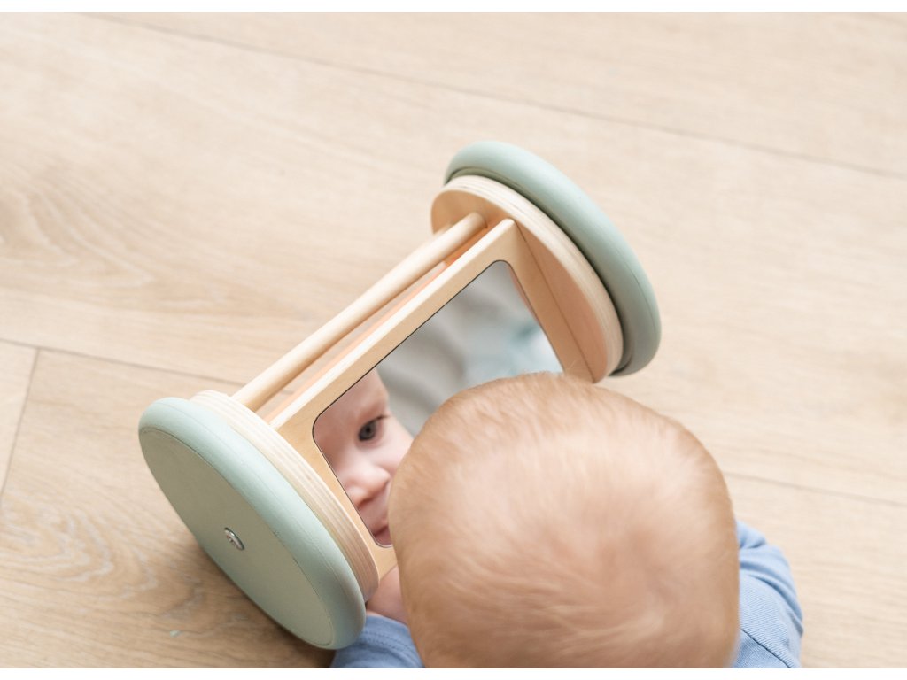 Tato hračka je vyrobena ze zodpovědně získaného dřeva s vodou ředitelnou nezávadnou barvou a zajišťuje vašemu dítěti zábavu i bezpečnost. Udělejte svému děťátku zábavu při hraní s tímto rolovacím zrcadlem, které kombinuje průzkum, pohyb a vizuální zapojení.