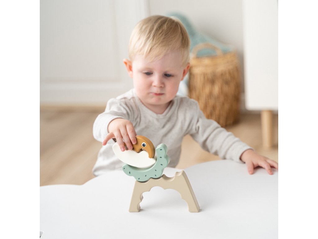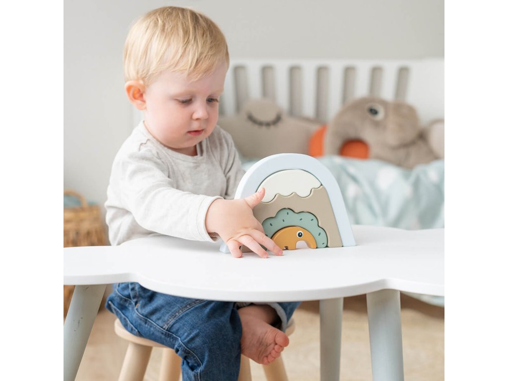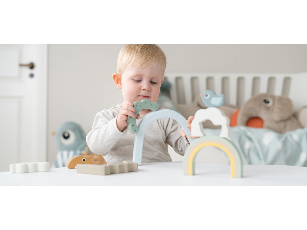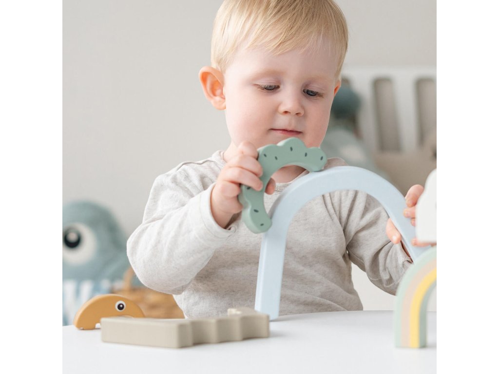 Přední stohovací tunel s 5 multifunkčními kostkami. Ideální pro nápadité hraní a řešení hádanek. Skládejte, vyvažujte a hrajte si s figurkami. Lze použít také jako puzzle. Dekorativní kousek do dětského pokoje v chladných zemitých barvách. Vyrobeno ze zodpovědně získaného dřeva a natřeno vodou ředitelnou barvou, která neobsahuje škodlivé látky, takže je pro vaše dítě bezpečné si s ním hrát.