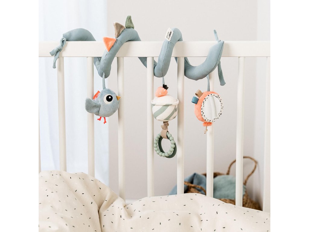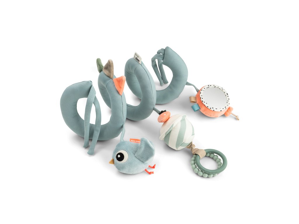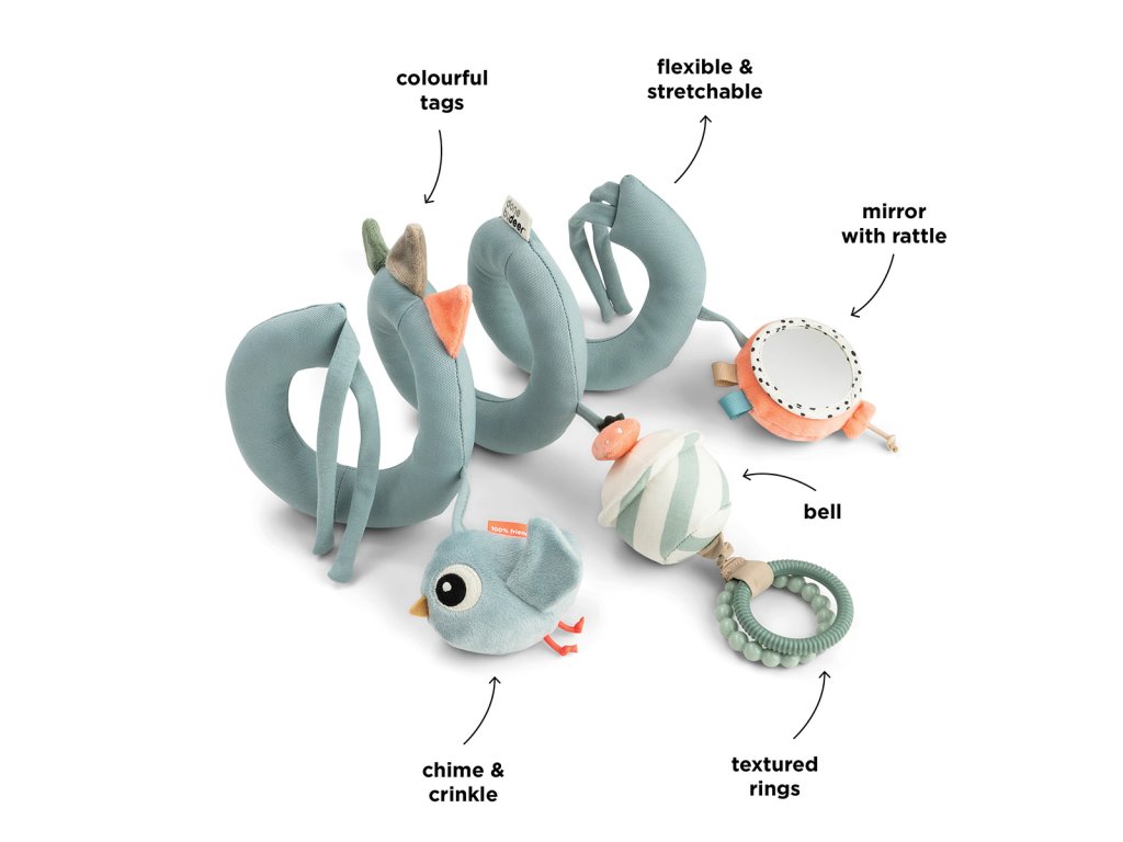 Spirála Celebration s aktivitami je plná smyslových funkcí, které může vaše ratolest prozkoumat. Hračku lze pomocí měkkých šňůrek připevnit k postýlce, autosedačce, nebo kočárku. Malé prstíky mohou objevit plyšovou Birdee a užít si jeho chrastivý zvuk. Senzorická spirála se zrcátkem zabaví Vašeho drobečka, když jste venku.