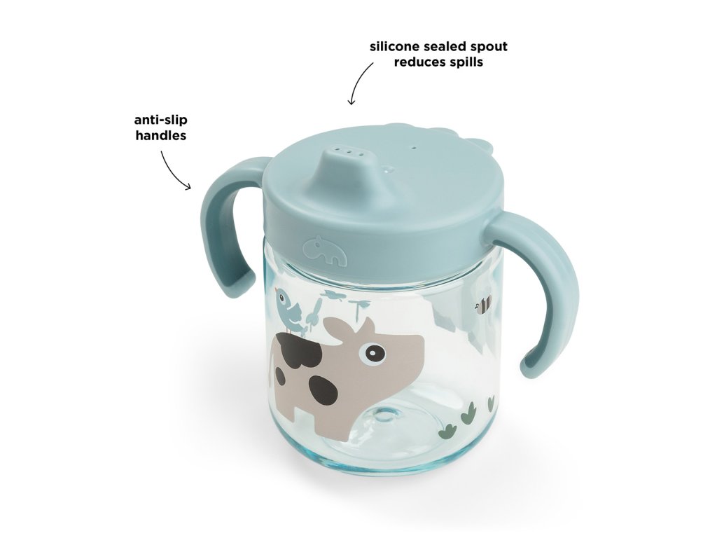 Hrneček s pítkem a dvěmi oušky je perfektní hrnek pro nejmenší, kteří si procvičují své první doušky. Protiskluzová ouška usnadňují uchopení hrnku malými ručkami. Silikonové těsnění zabraňuje rozlití. Půvabný hrnek s pítkem rozzáří každé jídlo.