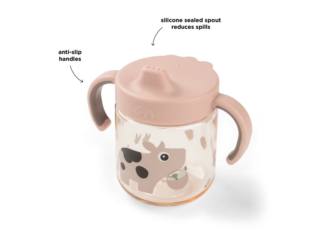 Hrneček s pítkem a dvěmi oušky je perfektní hrnek pro nejmenší, kteří si procvičují své první doušky. Protiskluzová ouška usnadňují uchopení hrnku malými ručkami. Silikonové těsnění zabraňuje rozlití. Půvabný hrnek s pítkem rozzáří každé jídlo.