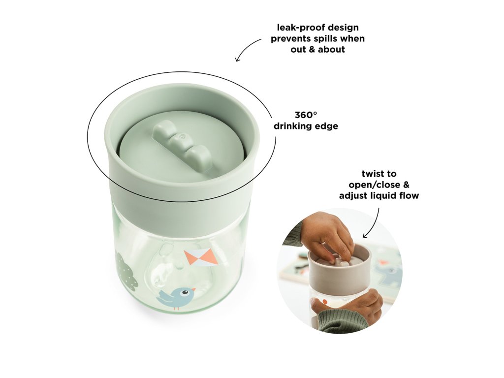 360° netekoucí učící hrneček dovoluje dětem nápoj z hrnečku jen usrkávat, ale hlavně učit se pít díky okraji ze kterého lze pít z jakékoliv strany. Otočením víčka regulujte průtok tekutiny. Hrneček je lehký a má perfektní velikost pro malé dětské ručičky.