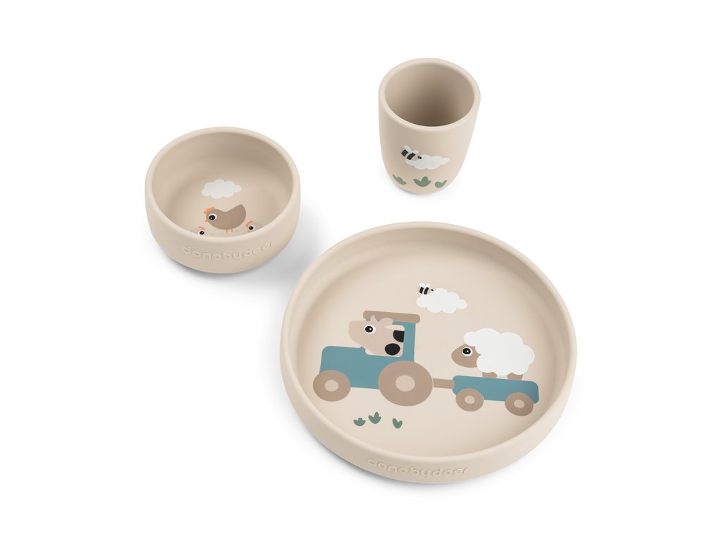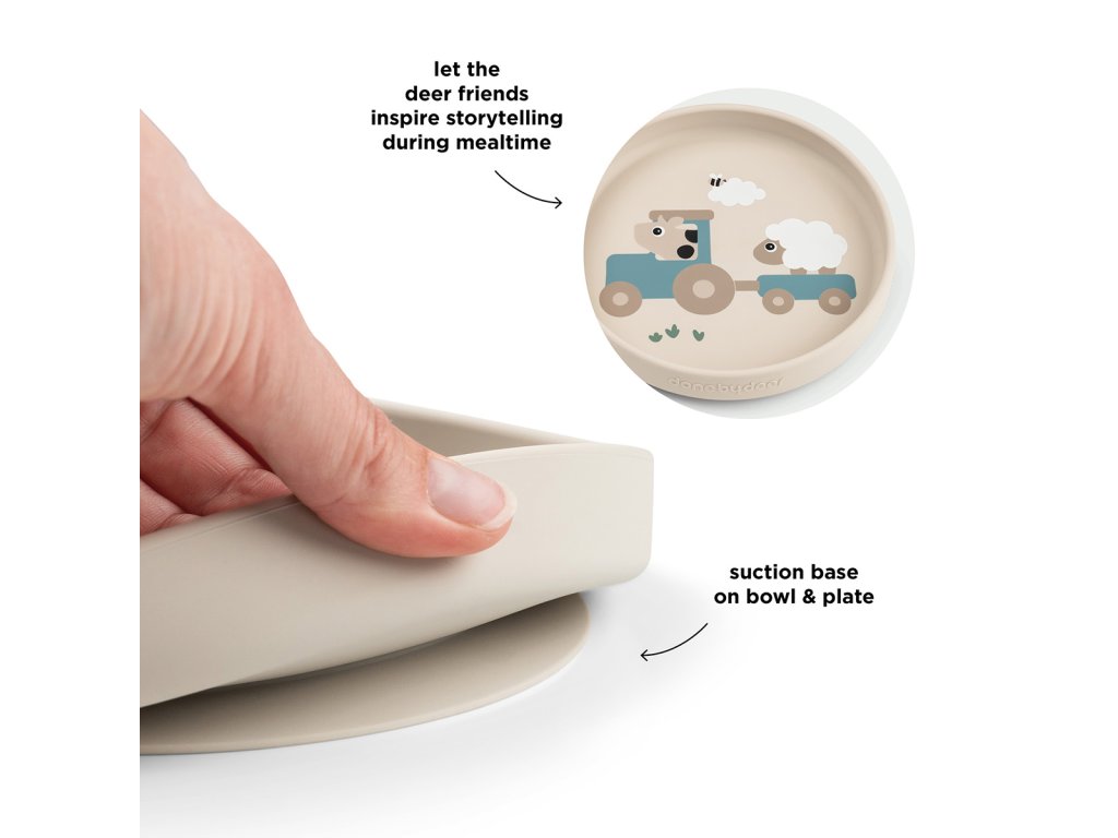 Silikonový jídelní set Stick & Stay Tiny farm - pískový