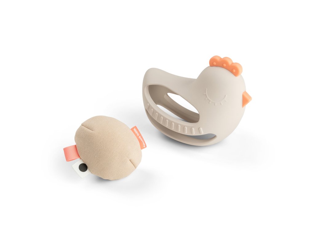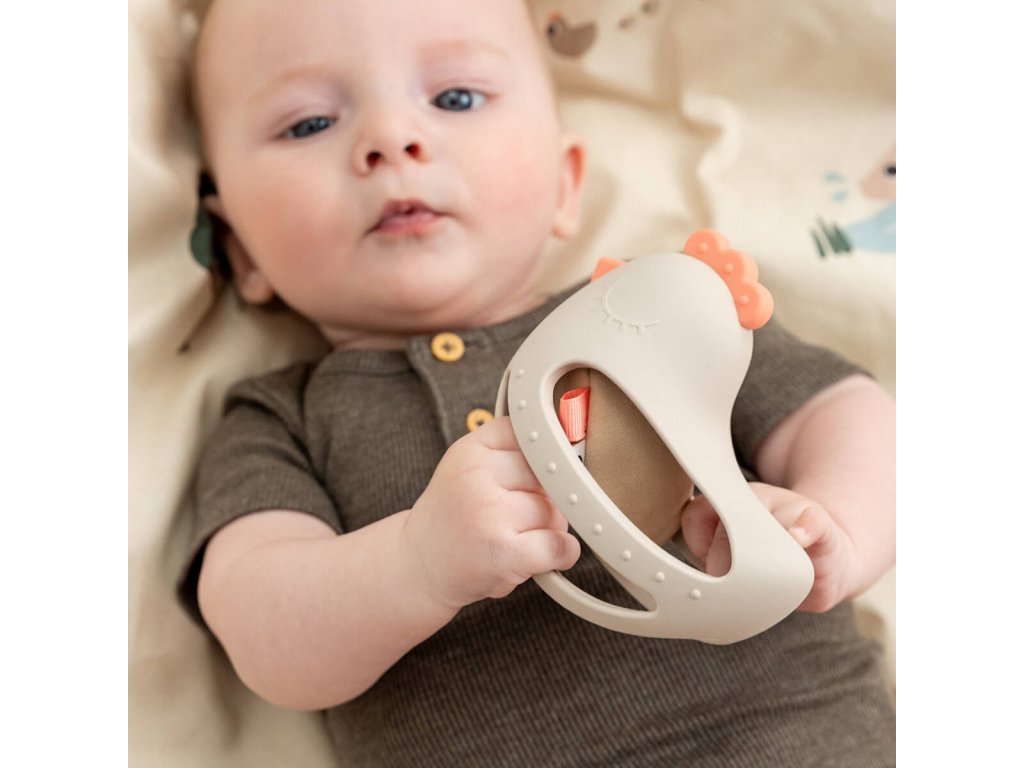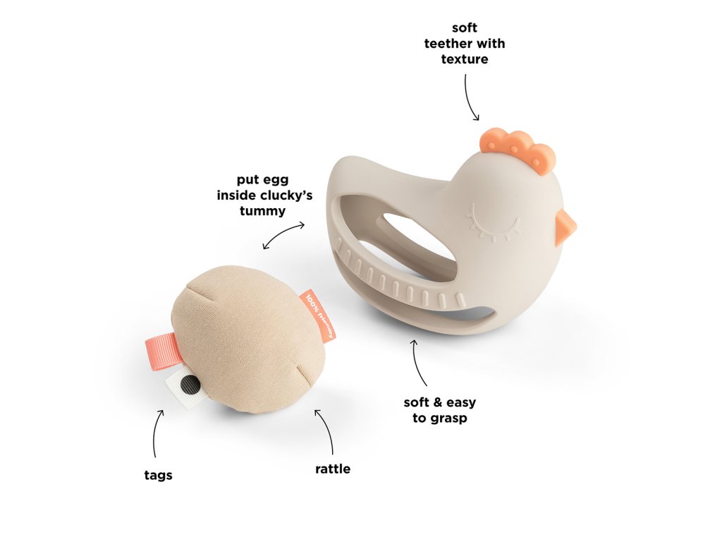 Měkké silikonové kousátko ve tvaru slepičky Clucky. Kousátko se snadno drží v malých ručkách. Roztomilé kousací hračky jsou vyrobeny z měkkého potravinářského silikonu. Kousátko je navrženo tak, aby padlo i do té nejmenší ručičky a stimulovalo zrakové a hmatové smysly dítěte. Měkké vajíčko, které chrastí lze snadno vyndat.