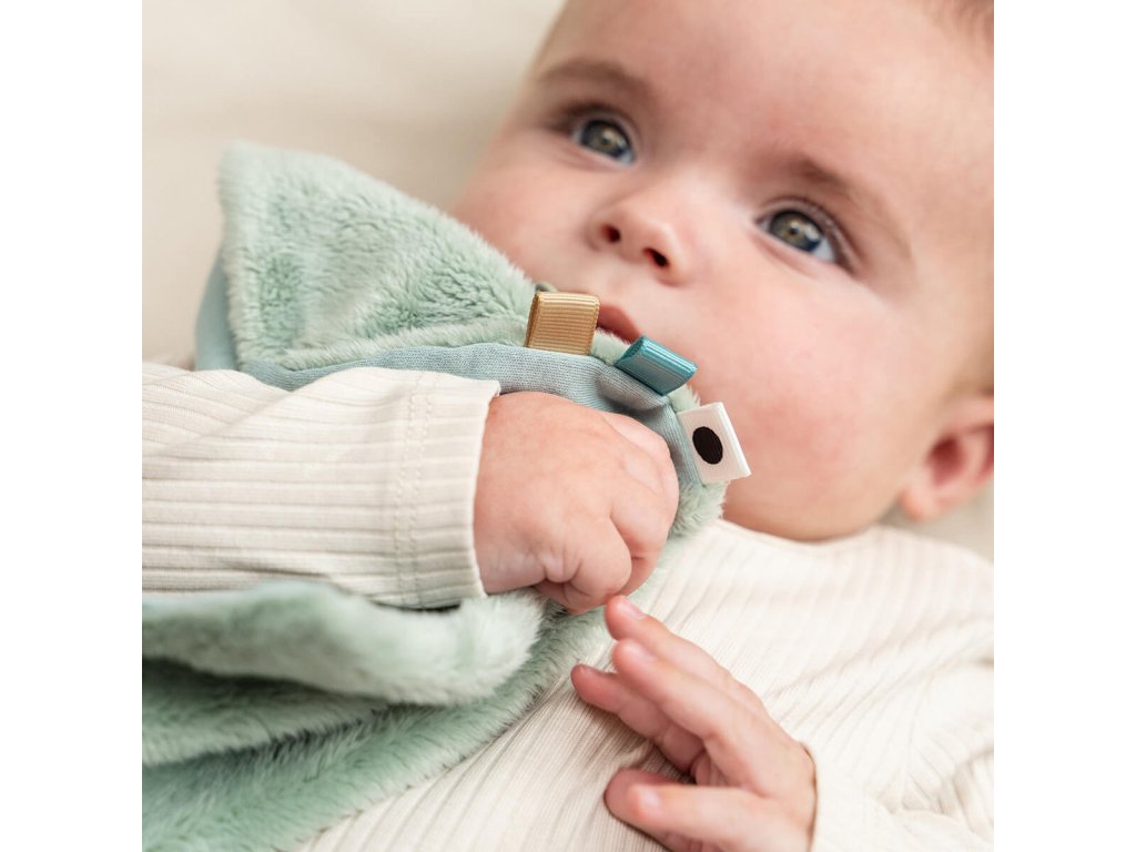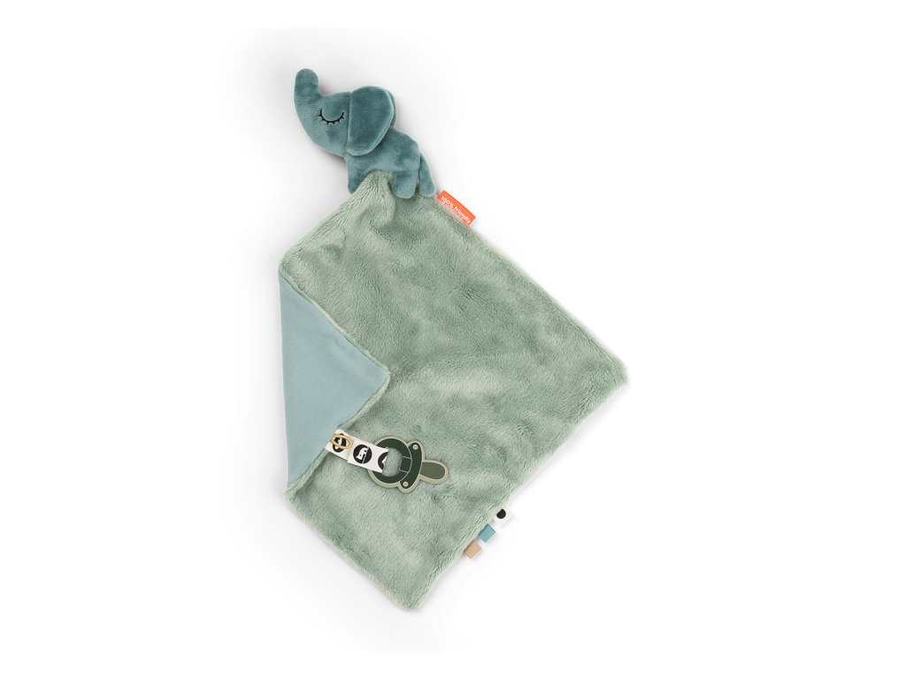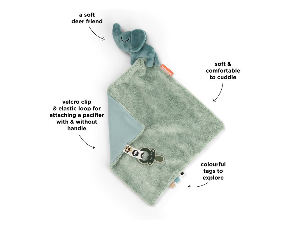 Mazlivá dečka Elphee se zábavnými štítky pro zvědavé malé prstíky a klipem na dudlík se zapínáním na suchý zip. Mazlíček má tu správnou velikost, aby ho děti mohly mít stále u sebe.