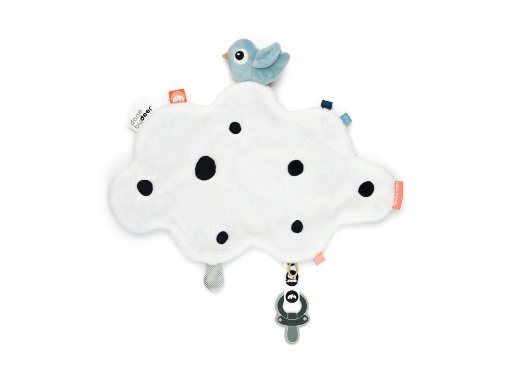 Dětská přítulka je plná zábavných štítků a vzrušujících textur připravených k prozkoumání. Malý Birdee dokonce vydává vrzání. Praktický klip na suchý zip udrží dudlíky v blízkosti.