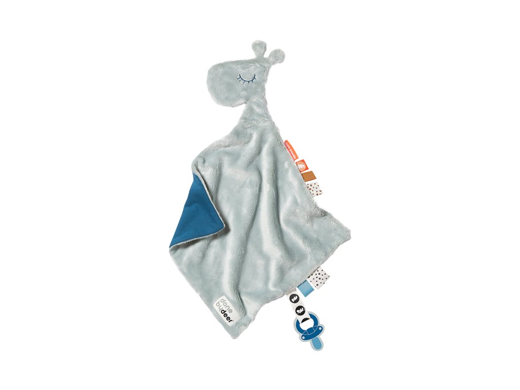Mazlivá dečka Raffi se zábavnými štítky pro zvědavé malé prstíky a klipem na dudlík se zapínáním na suchý zip.