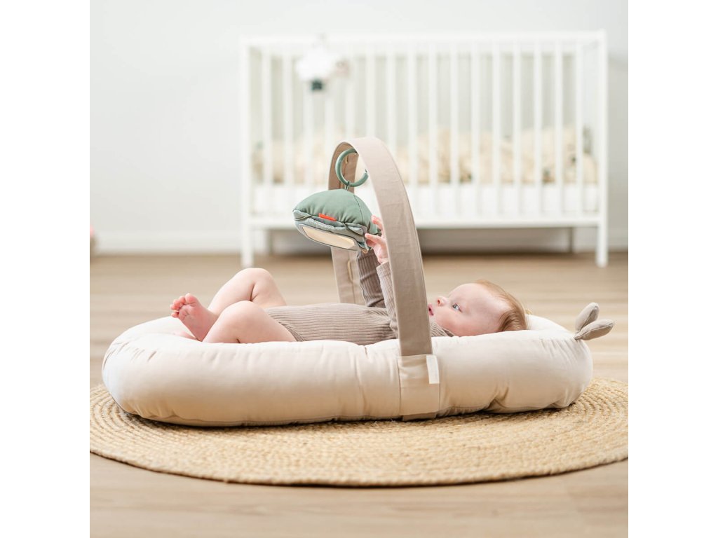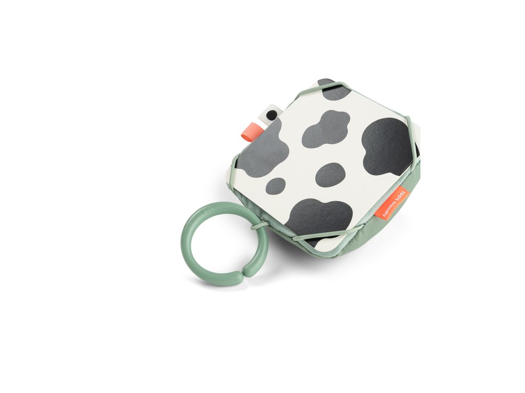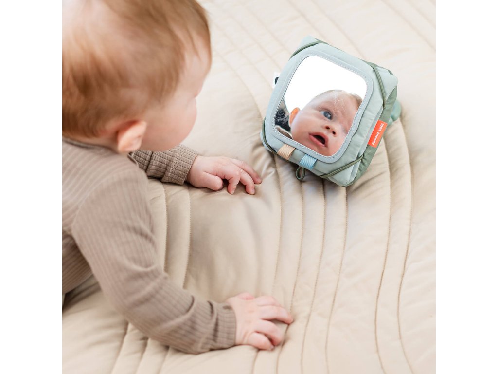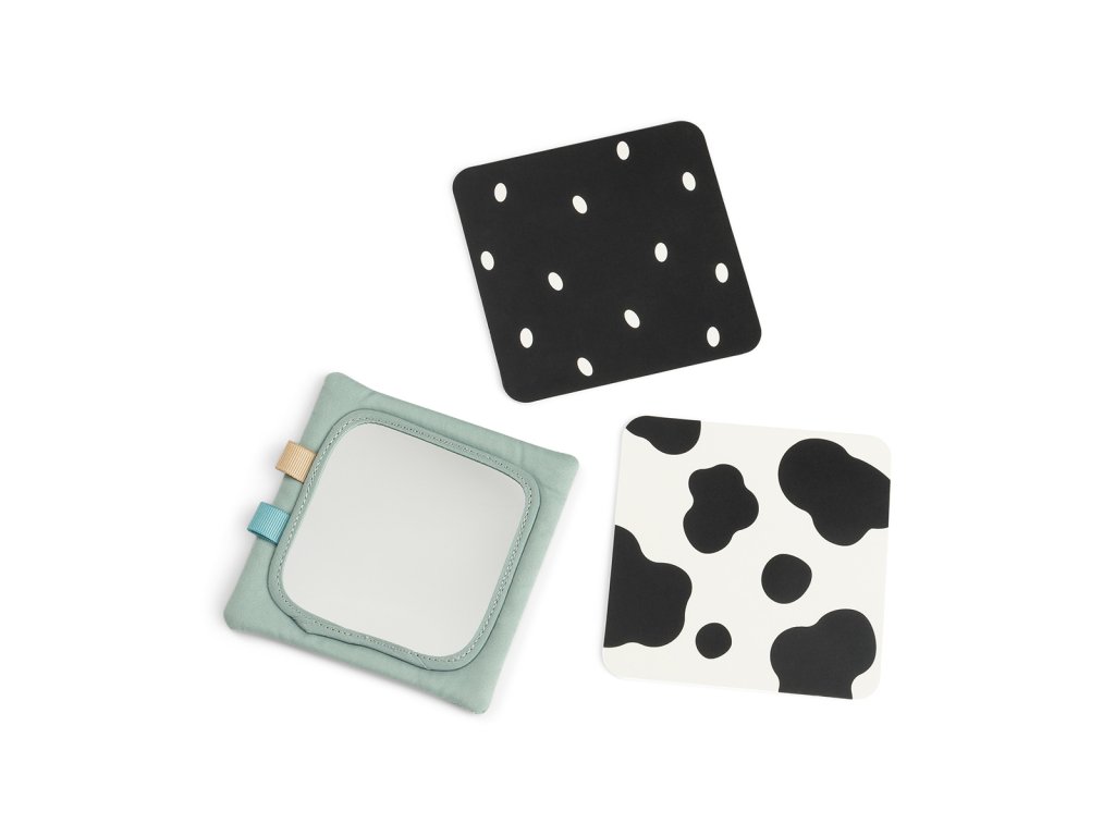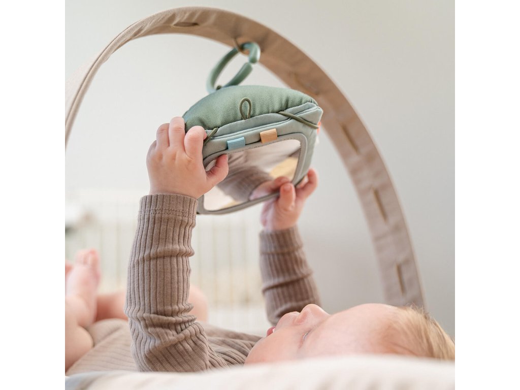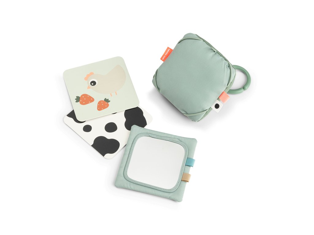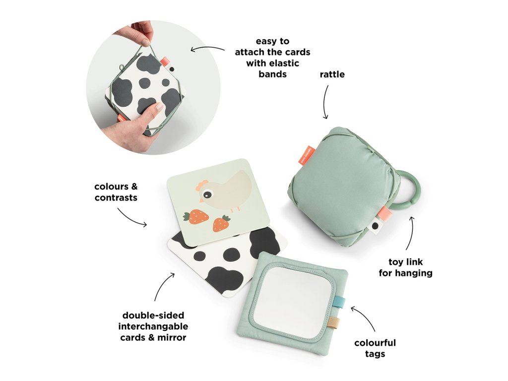 Měkký textilní držák na vyměnitelné obrázky. Doporučeno od 0 měsíců. Ideální pro rozvoj zraku vašeho dítěte. Přizpůsobte si jej přidáním vlastního obrázku nebo kresby do držáku. Dodává se se zrcátkem a dvěma oboustrannými kontrastními kartami. Zavěste ho na hrazdičku nebo podložku na hraní nebo ho položte na podlahu a procvičte si polohu na bříšku.