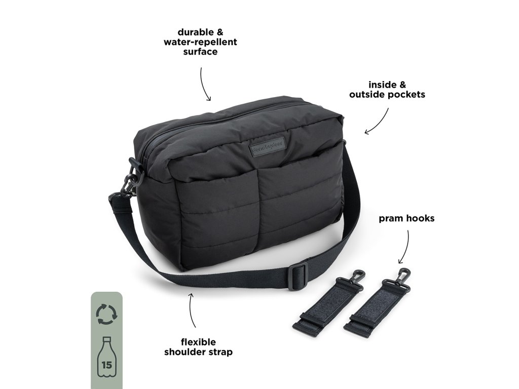 S touto cool prošívanou přebalovací taškou budete mít dostatek prostoru, abyste si vzali vše, co potřebujete pro své děťátko i pro sebe. Má kapsy na vnitřní i vnější straně. Povrch odolný vůči povětrnostním vlivům chrání vaše nezbytnosti před navlhnutím. Taška a přebalovací podložka jsou vyrobeny z recyklovaného polyesteru vyrobeného ze 15 použitých PET lahví. Poutka usnadňují připevnění tašky ke kočárku.