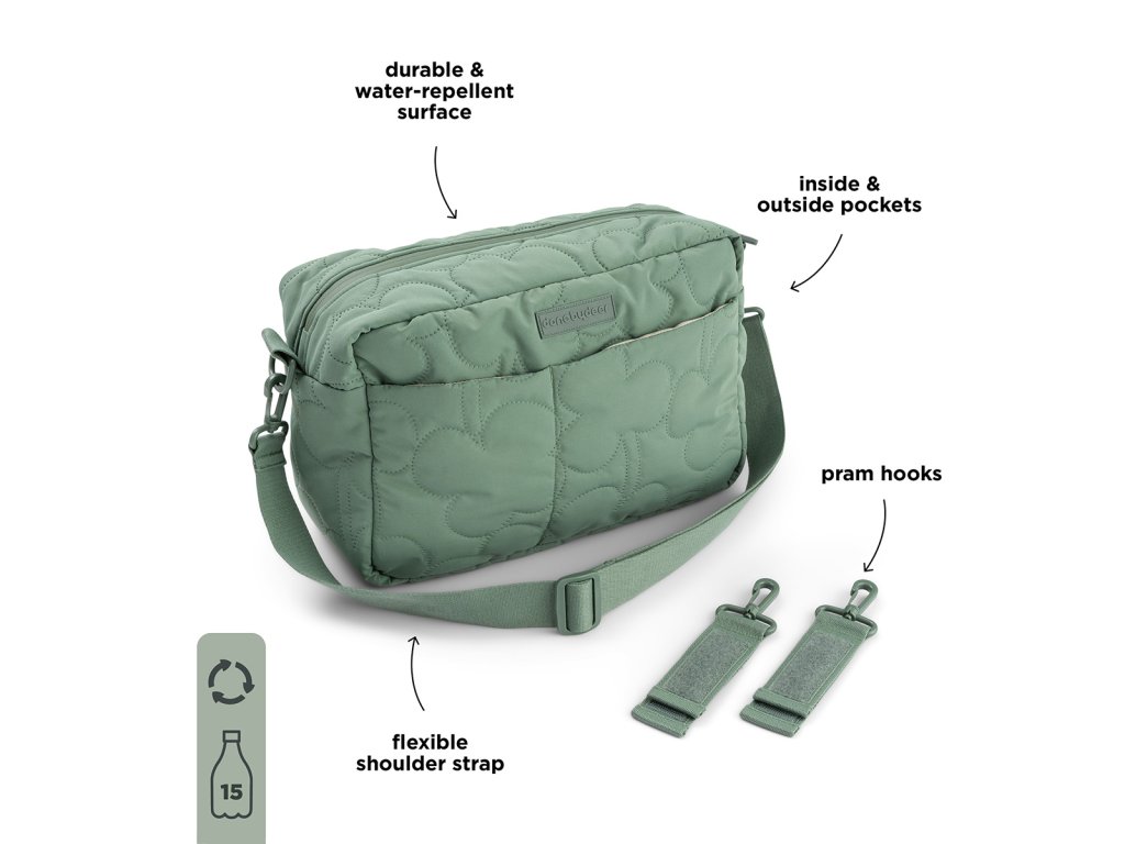 S touto cool prošívanou přebalovací taškou budete mít dostatek prostoru, abyste si vzali vše, co potřebujete pro své děťátko i pro sebe. Má kapsy na vnitřní i vnější straně. Povrch odolný vůči povětrnostním vlivům chrání vaše nezbytnosti před navlhnutím. Taška a přebalovací podložka jsou vyrobeny z recyklovaného polyesteru vyrobeného ze 15 použitých PET lahví. Poutka usnadňují připevnění tašky ke kočárku.