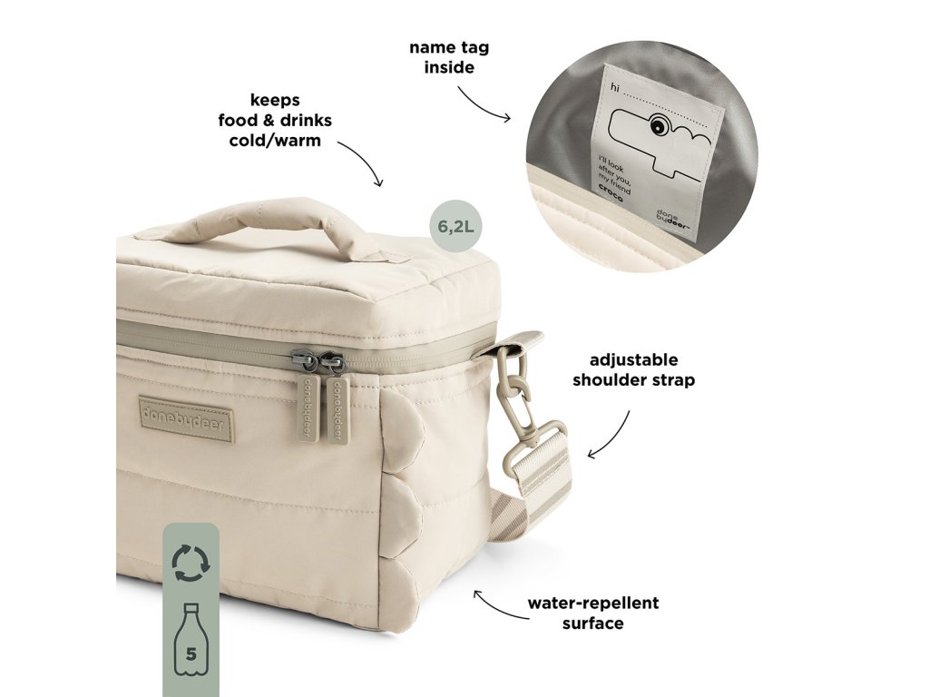 Prošívaná izolovaná taška Croco je ideální pro uchování potravin a nápojů chladných nebo teplých. Má praktický povrch odolný vůči povětrnostním vlivům s izolační látkou uvnitř. Taška je prostorná a snadno se do ní vejde krabička na oběd, láhev a nějaké krabičky na svačinu. Taška se snadno otevírá a zavírá pomocí voděodolného dvoucestného zipu. Uvnitř je praktická jmenovka. Taška je vyrobena z recyklovaného polyesteru vyrobeného z 5 použitých PET lahví. Chytrá termo taška na oběd je navržena v hezké barvě. Dodává se bez chladicích prvků.